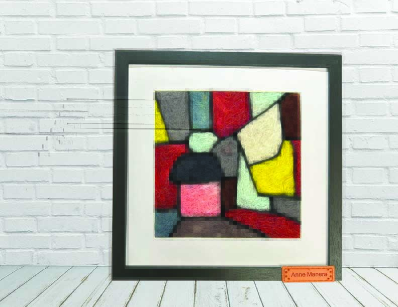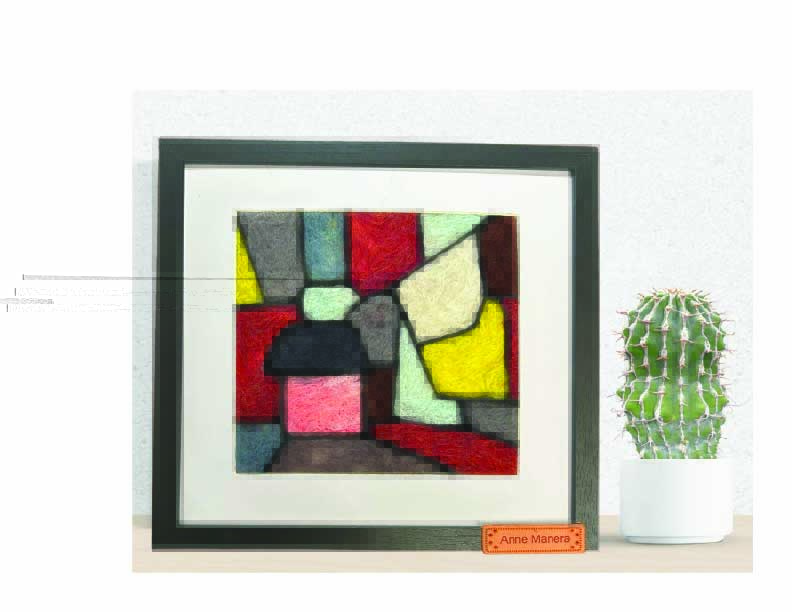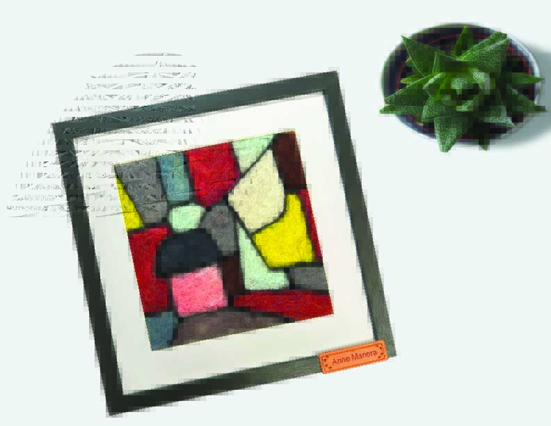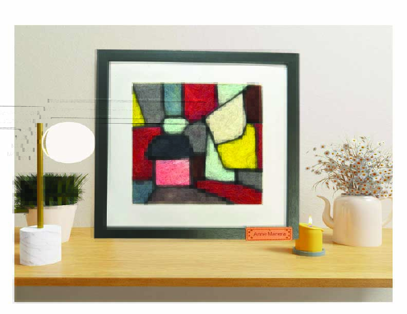 Bold and modern, Cubist House is an original felted wool painting by Anne Manera that brings geometric abstraction to life with rich texture and color. This piece features a simple house form nestled among bold blocks of crimson red, golden yellow, charcoal black, cream, and soft pastels, all outlined in striking black lines reminiscent of stained glass.
