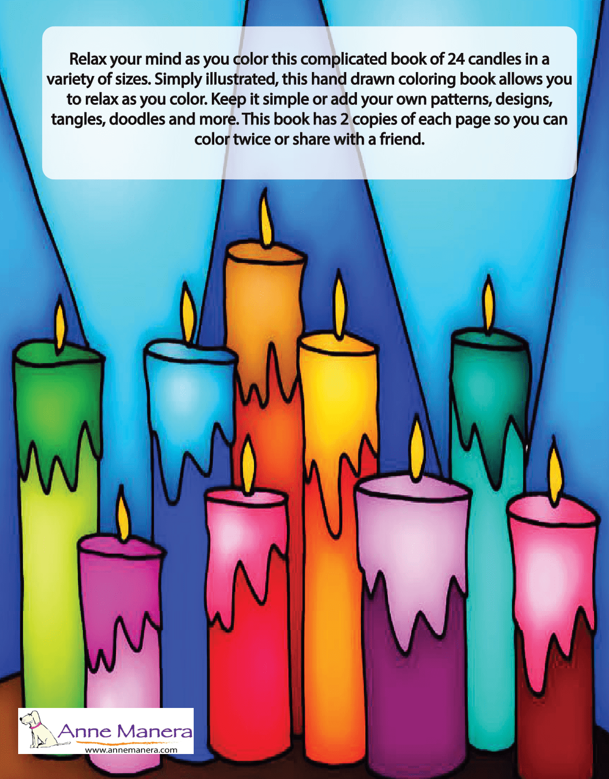 Relax your mind as you color this complicated book of 24 candles in a variety of sizes. Simply illustrated, this hand drawn coloring book allows you to relax as you color. Keep it simple or add your own patterns, designs, tangles, doodles and more. This book has 2 copies of each page so you can color twice or share with a friend.
