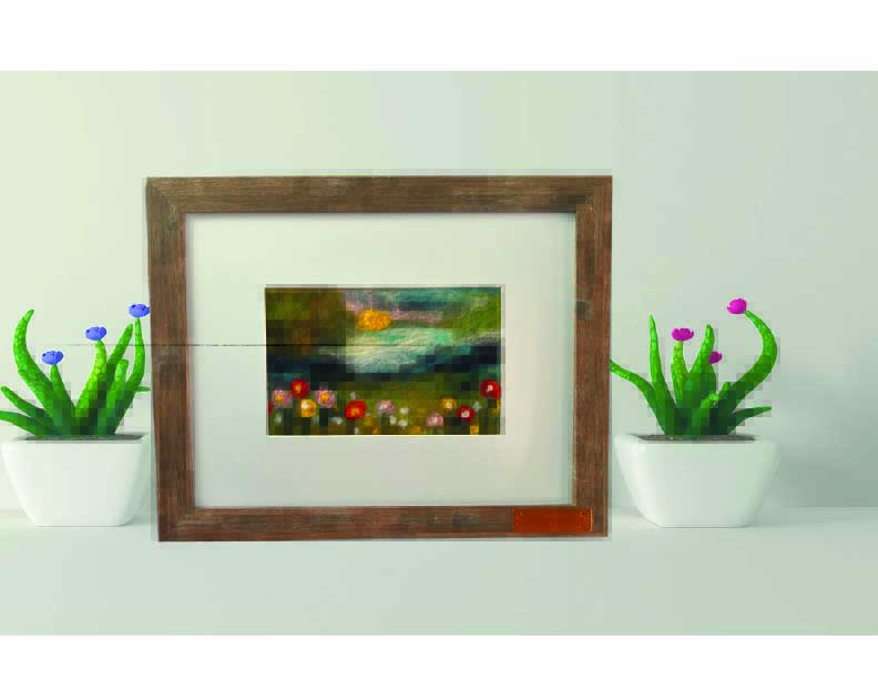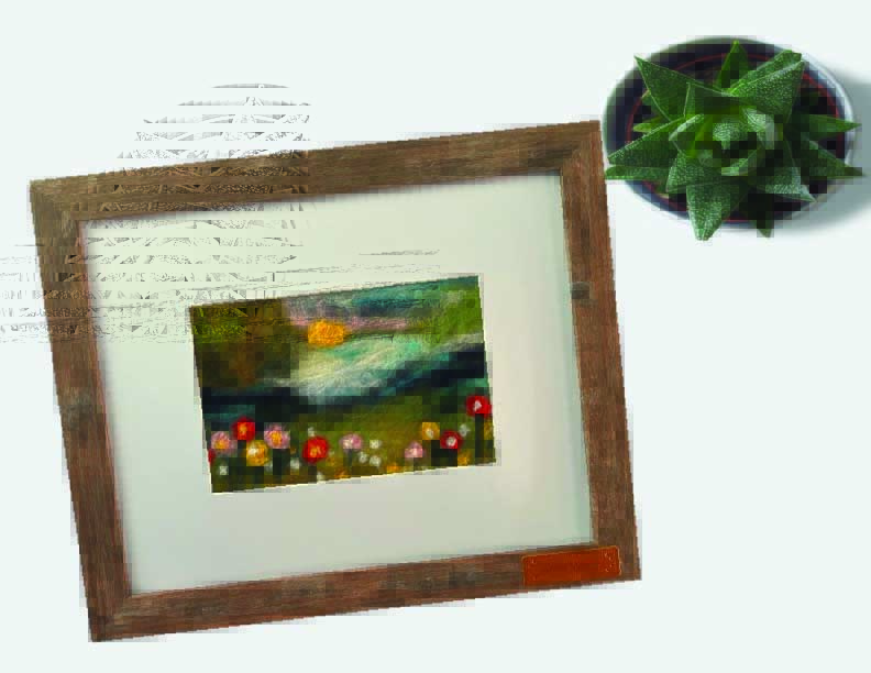 Bring the beauty of nature indoors with Sunny Meadow, an original felted wool painting by Anne Manera. This serene landscape captures a golden sun rising over rolling hills, with soft blue skies and a meadow bursting with colorful wildflowers. Crafted entirely from hand-dyed wool fibers, this piece blends gentle texture with rich color, evoking a peaceful morning scene. Framed in rustic wood for a warm finish, Sunny Meadow is perfect for modern spaces, art collectors, or anyone who appreciates abstract design.